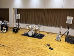 演奏する楽器機器一式とボーカルとキーボードの拡声用にスピーカーを設置致しました。